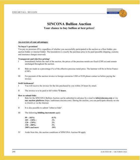 I Bids for the SINCONA Bullion-Auction can be submitted in advance by e-mail to info@sincona.com or via