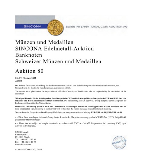 Wichtiger Hinweis: Die im Katalog neben dem Startpreis in CHF zusätzlich aufgeführten Startpreise in EUR und USD sind rein