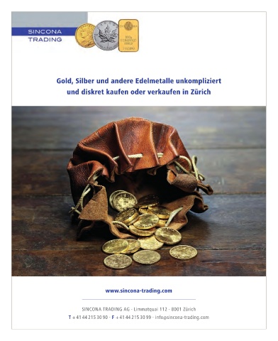 Gold, Silber und andere Edelmetalle unkompliziert und diskret kaufen oder verkaufen in Zürich www.sincona-trading.com SINCONA TRADING AG · Limmatquai 112 · 8001 Zürich T + 41 44 215 30 90 · F + 41 44 215 30 99 · info@sincona-trading.com